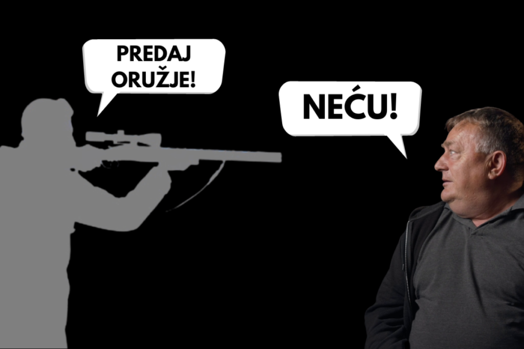 Ja sam rekao – ja oružje ne dam! Nastao je tajac. Onda je Vezmar rekao da ne radim probleme na što sam ja rekao da on pravi problem. Nije mi bilo jasno zašto bi nas razoružali kada nismo napravili nikakav problem. Stari milicajci nisu reagirali, šutili su. Ja još uvijek stojim i čekam što će se dogoditi. Vezmar me poslao van iz dvorane, a ja sam krenuo prema njemu i stao sam iza njega. Gledam kolege, nitko ne reagira, bio sam ga spreman razoružati, ali nisam dobio nikakav signal od nadređenih Hrvata. Osjećao sam da se preznojava i trese. Imao sam ruku na pištolju i bio sam spreman zarobiti ga pa da započnemo pregovore. To je sve u mojoj glavi bilo kao neki film. Nakon pola minute krenuo sam van. E kad sam ja otvorio vrata od hodnika, boktemazo, pun hodnik četnika, pun hodnik rezervista s dugim naoružanjem, šinjelima. Ja krenem nazad, gotovo je, nema nazad, Pavić me gurne ajde ti naprijed. Kada sam došao tamo svi su gledali u mene i brzo sam prešao u drugu prostoriju. Tamo je bio Luka Vukejilović, skladištar. Rekao je – o evo Grgića, evo oružja. Ja velim – ja oružje ne dam! Kad sam ja to rekao oni su svi digli snajpere u mene, puške. Ne znam kako nisam osjećao strah. Gledam sada u njih i pitam ih – hoćete li vi sad pucati u mene? Jedan mali iz Kukunjevca slegnuo je ramenima i rekao – ne znam. Rekao je da im je naređeno. Kada sam ih pitao čija je naredba oni vele opet – ne znamo. Rekao sam im da sam se s Jovom dogovorio da ne predam oružje. Sjeo sam tamo i zapalio cigaru. Bilo je jako napeto. Dolazili su moji kolege i ostavljali oružje i tada sam odlučio da ću i ja predati oružje.